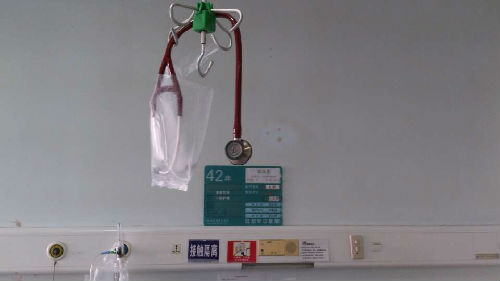 听诊器统一悬挂于病床尾端的输液架上,然后将听诊器耳塞端放入用废弃软袋液体外包装袋制作成的有耳挂袋内。此方法将听诊器耳塞端与胸件端隔离,从而避免耳塞端被污染,可有效防止交叉感染,受到医护人员与患者的一致好评。