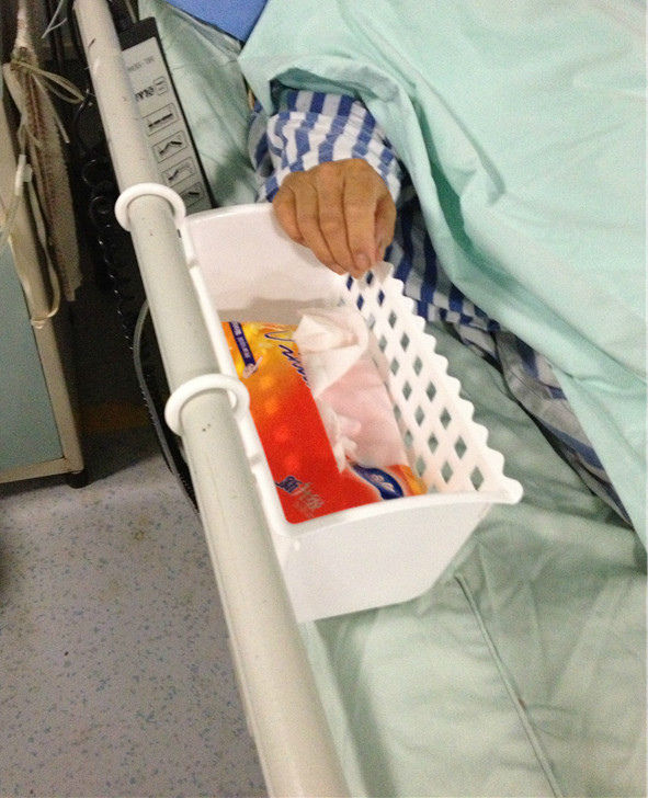 在ICU实行24小时无陪护制度,近日有患者反应,在拔出气管插管自行咳痰时,擦拭痰液的纸巾时常随着床上活动而滚落到床脚或被床被遮盖,不方便寻找拿取,针对此问题,全体护理人员共同商议后在每张病床的床挡上增加了小挂篮,将纸巾或常用品放入内,既方便实用又美观,此方案的投入使用,让护理服务不再机械,获得患者一致好评。