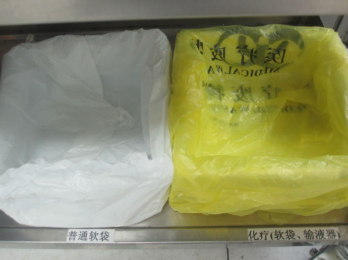 临床常用的垃圾筐多是塑料网眼垃圾筐,这类垃圾筐易坏、易漏、不易清洗,用于装输液软袋,虽然套有塑料袋,但输液软袋内的残留液体也因各种原因常漏到治疗车下层,尤其是化疗药物残留液体,不仅污染治疗车,而且对病室环境造成污染,危害患者、家属及医务人员的健康。针对这一情况,肿瘤日间病房把预充式冲洗器包装盒(图1)收集起来,代替垃圾筐,此包装盒表面平滑,不漏水,大小适中,在盒内按医院规定套上垃圾袋(图2),放置输液软袋,脏了、坏了可直接换掉,不用清洗。此方法不仅节约了人力物力,而且有效避免了化疗药物的二次污染,给患者创造了一个安全的就医环境、给医务人员创造了一个安全的工作环境,提高了患者及医务人员的满意度。