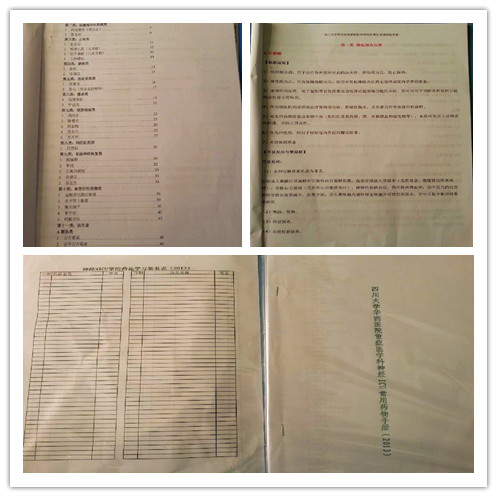 围绕“三级综合医院评审” 的要求,科室管理小组对科室安全管理进行自查后发现,由于临床上使用的药物多、更新快,药物的使用及用药后疗效和副作用的观察给轮转年轻医生、护士及进修生临床工作带来了极大的挑战,为了方便轮转医护人员对神经ICU常用药物学习,避免药物使用不规范的发生,神经ICU医护一体化小组以药物说明书为基础,结合科室用药的特殊需求编写了“神经ICU常用药物手册(2013版)”,包括降低颅内压类、抗癫痫类、促脑神经恢复类、血管活性药物类、抗生素类、镇静镇痛类、止血类、解热类、激素类、止血类、钙拮抗剂类。