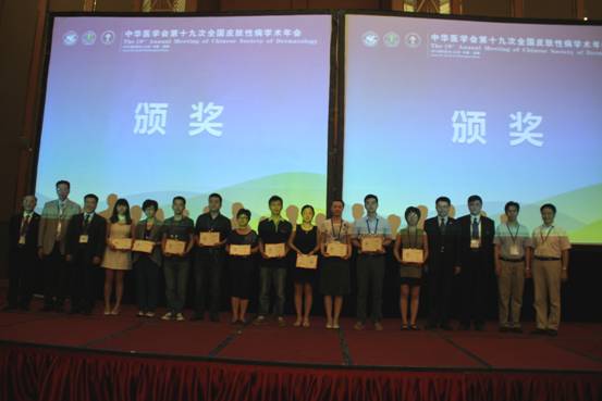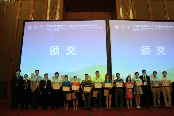 我院皮肤科以在此会上展示学术成果而引以为豪,大家踊跃投稿,被大会论文汇编接收42篇,其中18人次进行大会发言,24篇壁报交流,备受瞩目和好评。我院医生及研究生活跃于各个会场和展厅,为国内外同行所关注。会上,皮肤科获得了“国家级皮肤医疗美容示范基地”授牌,陈涛医师获得了年度优秀研究生称号,胡文英获得了优秀壁报奖,庄凯文获得亚太医学真菌学大会电子壁报三等奖。