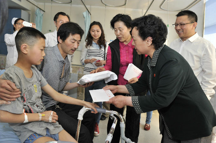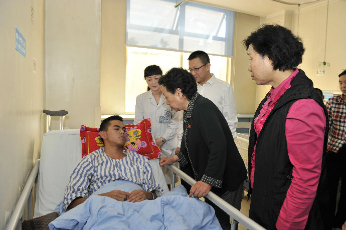 5月10日上午,四川省关心下一代工作委员会常务副主任李进、副主任曾清华,副主任胡继先一行人来到我院,在医院党委李正赤副书记等人陪同下,探望了4.20雅安地震中受伤住院的14位青少年。在悉心慰问每一位在地震中受伤的孩子后,康复科何成奇主任向省关工委领导们介绍孩子们受伤、治疗以及恢复的情况。