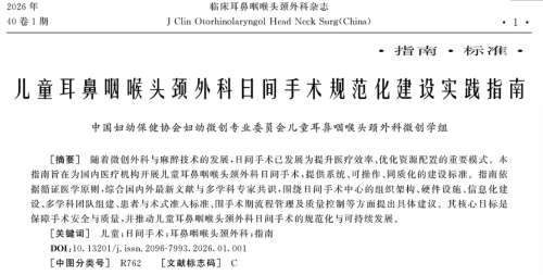 近日,我院耳鼻咽喉-头颈外科邹剑教授、吕丹副教授、雷蕾副主任医师作为专家组成员,深度参编的三部儿童耳鼻喉疾病诊疗相关指南在《临床耳鼻咽喉头颈外科杂志》正式发布,内容覆盖儿童扁桃体术后疼痛管理、日间手术规范化建设、开放性喉气管成形术规范化诊疗等关键领域,充分彰显了我院在该学科领域的学术地位与行业影响力。
