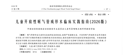 《儿童开放性喉气管成形术临床实践指南(2026版)》由中国妇幼保健协会妇幼微创专业委员会儿童耳鼻咽喉头颈外科微创学组牵头组织编写,邹剑教授、吕丹副教授参与撰写,为临床开展儿童开放性喉气管成形术提供了兼具指导性与实用性的科学依据。