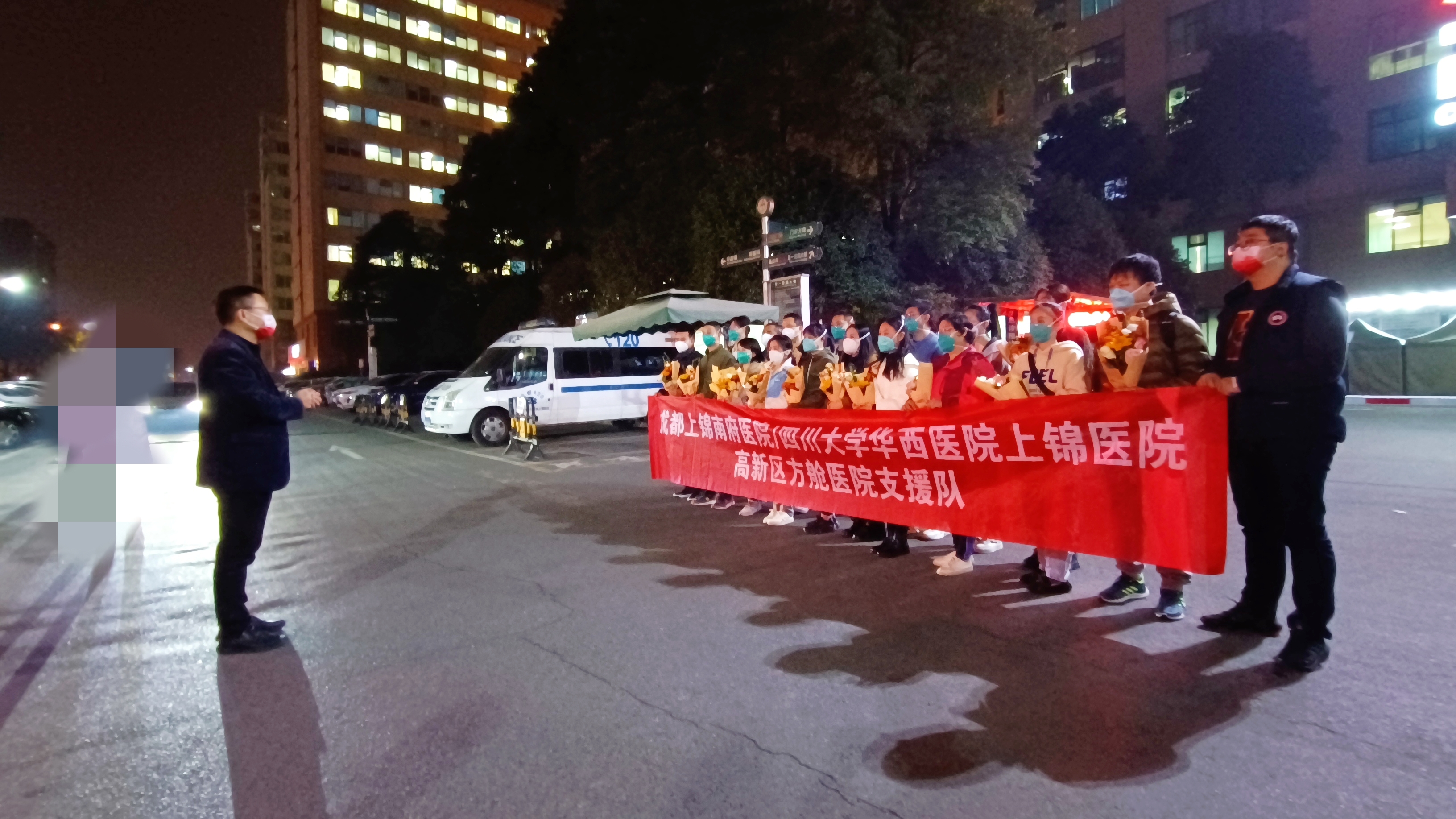 晚上9:00,我院杜晓冬副院长带领相关职能部门在医院欢迎逆行者回家,并为队员们献上鲜花。杜院长代表医院对方舱医院支援队的辛苦付出表示感谢,并表示支援队不负重托、不辱使命,圆满完成支援任务,展示出了华西上锦人良好的精神风貌和艰苦奋战的拼搏精神。疫情防控进入新阶段,作为华西医院全托管医院,上锦医院全体职工将不忘初心,牢记使命,救死扶伤,关怀服务,充分发挥华西技术水平优势,为人民健康保驾护航。