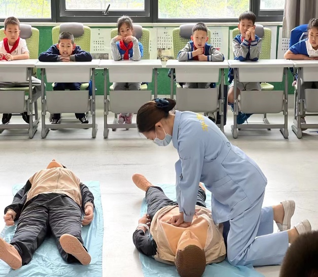 心肺复苏是抢救心跳呼吸骤停患者的一项重要技能,尽早的心肺复苏能够给患者赢得宝贵的抢救时间。为普及健康知识,提高学生的安全意识,提升自救、互救能力,近日,我院组织“华西上锦健康快车”走进天立学校小学课堂,急诊科医务人员为小朋友们开展心肺复苏技能培训。