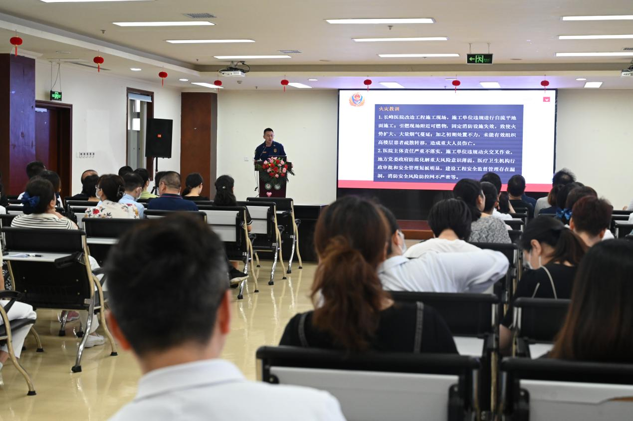6月21日,我院邀请高新消防救援大队蓝运红教官开展医院消防安全知识专题讲座,各科室安全生产小组成员参加培训。蓝教官通过多起医院真实火灾案例与自身一线救援经历,指导如何预防发生医院火灾,以及发生火灾后如何及时扑救和组织疏散逃生。
