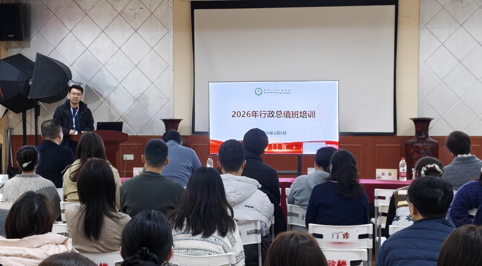 培训会上,后勤保障部运维安保科邓继业科长围绕安全稳定讲述突发事件的现场协调与应急疏散要点;院长办公室廖钦主任介绍了行政总值班的管理规则、工作要求、工作方法与服务保障等内容,对春节期间值班注意事项做了明确,特别强调了值班纪律和工作态度要求;医务部邱实部长梳理了非工作时间内会诊协调等情形的处理原则与标准化流程;医院感染管理科张琳老师明确了医院感染聚集、职业暴露、特殊传染病隔离及突发公共卫生事件的上报路径与多部门联动机制。