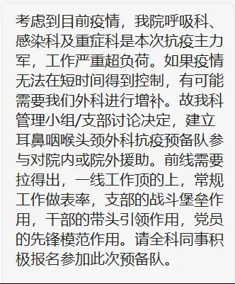 郑芸书记接到抗疫通知后,立即在科室群里号召建立耳鼻咽喉头颈外科抗疫预备队,为全面抗疫做好充分准备。号召一经发出,短短20分钟,已有79人报名参战,上下一心、众志成城。