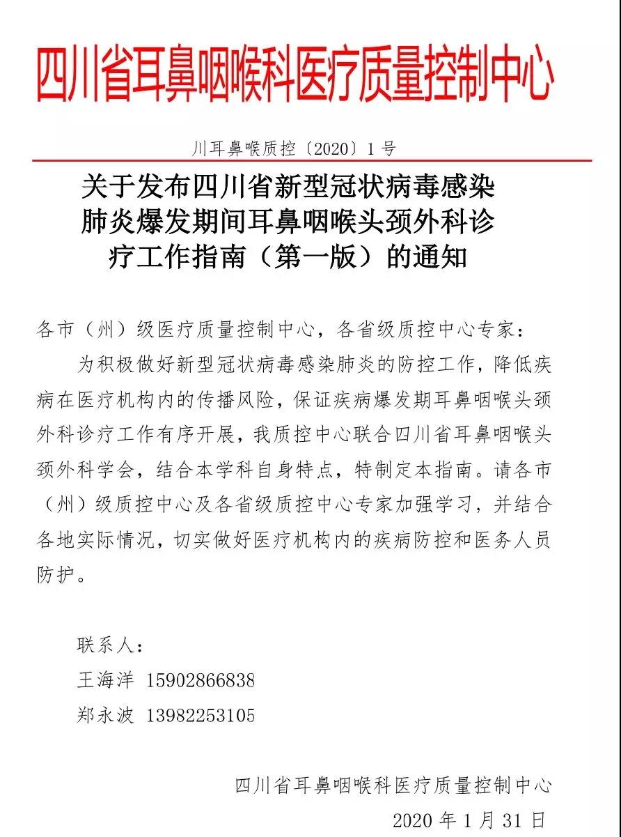在接到疫情防控相关通知后,华西耳鼻喉立即行动起来。由我科王海洋医生起草,刘世喜主任、赵宇副主任审核,协助四川省耳鼻咽喉头颈外科学会与四川省耳鼻咽喉头颈外科质控中心紧急制定《四川省新型冠状病毒感染肺炎爆发期间耳鼻咽喉头颈外科诊疗工作建议》,经多方商讨、反复修改,该建议于2020年1月31日正式发布。