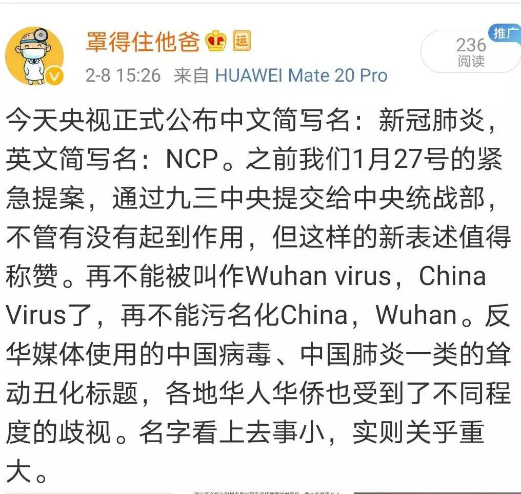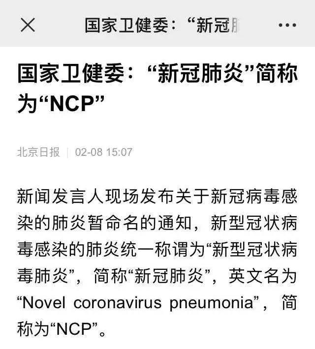 2月8日,国家卫健委正式发布通知,将新型冠状病毒肺炎的英文名统称为“Novel coronavirus pneumonia”(简称NCP)。这一改变对维护武汉乃至国家的声誉有重大意义,绝不允许因为“别名”而污化武汉,污化我们的国家!