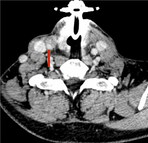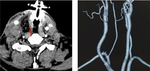 该患者5年间因罹患甲状腺癌,先后辗转于北京、上海、浙江等多家知名医院,共接受5次手术治疗、2个疗程的I131治疗。1年前患者肿瘤再次复发,行靶向治疗效果不佳,且肿瘤已包绕并侵犯右侧颈总动脉及颈段气管右侧壁。患者在前次手术医生建议下于我院耳鼻咽喉·头颈外科陈飞教授处就诊。