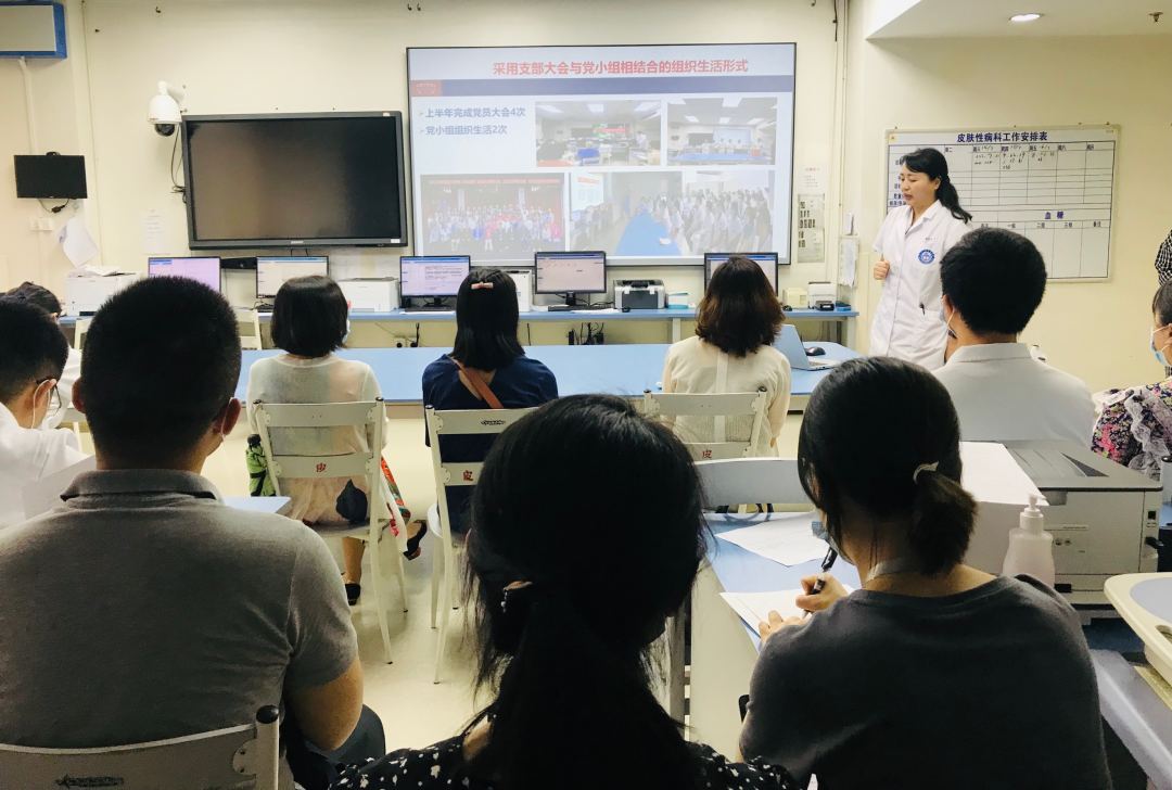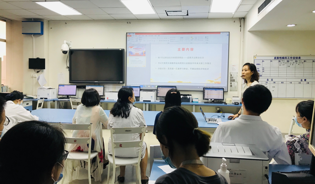 为深入学习贯彻习近平总书记在党史学习教育动员大会上的重要讲话精神,推动党史学习教育走深走实,2021年7月15日下午16:30,皮肤性病科党支部在示教室开展了以“学党史、悟思想、谈心得、促提高”为主题的组织生活会。会议由支部组织委员李晓华同志主持。