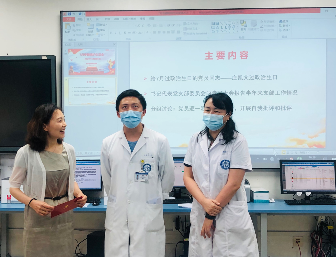 会议首先由支部书记黎静宜为本月政治生日党员庄凯文同志赠送贺卡,庄凯文同志收到贺卡内心很激动,他说:青春由磨砺而出彩,人生因奋斗而升华,作为一名青年党员,要以实现中华民族伟大复兴为己任,增强做中国人的志气、骨气、底气,不负时代,不负韶华,不负党和人民的殷切期望!更好的为患者服务。接着由支部书记黎静宜教授代表党支部委员会向党员报告半年来党支部工作情况,开展党史学习教育情况,并通报党支部检视问题情况。随后,党员同志们从学习习近平总书记在庆祝中国共产党成立100周年大会上的重要讲话情况,谈自己的心得体会;学习习近平新时代中国特色社会主义思想和党中央指定学习材料情况,谈感悟和收获;对照党史学习教育目标要求,谈自身在坚定理想信念,增强历史自觉,弘扬优良传统,加强党性锤炼等方面还存在哪些差距和不足;以及党员先锋模范作用发挥怎么样,立足岗位、履职尽责做得怎么样,为身边师生群众做了什么实事好事,还有哪些差距等方面进行了逐一发言,讲收获提高,讲差距不足,开展自我批评和批评。