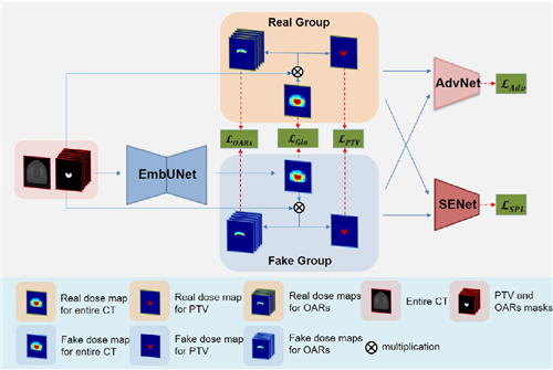 受生成对抗网络(GAN)令人印象深刻的进展的启发,研究人员也开始考虑将其应用于剂量预测。事实上,局部细节信息和全局情境信息在剂量图中是共存的,是剂量分布预测的关键。然而,大多数基于GAN的方法更喜欢从pix2pixGAN (Isola等人,2017)中提取想法,该方法使用了UNet (Ronneberger等人,2015)等简单的体系结构作为生成器。在这种情况下,很难同时提取这两种信息,要么是由于层过深导致局部信息丢失,要么是由于层过浅导致全局信息不可用。此外,这些基于GAN的方法在训练时往往采用了整体图像的内置对抗性损失和像素级L1损失,忽视了局部各器官特定剂量分布的细化,可能导致次优结果。