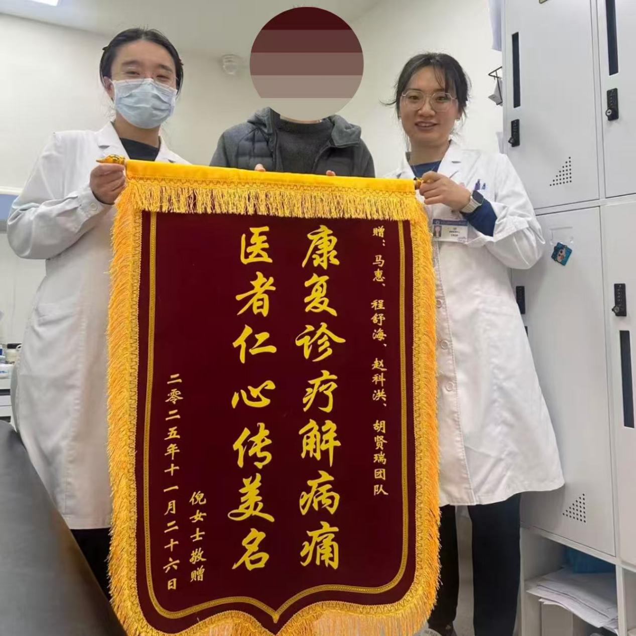 第一面锦旗来自一位因“颅内占位性病变”接受手术治疗的患者家属。围手术期内,康复医学中心神经外科康复治疗小组第一时间介入,由马惠、程舒海、赵科洪、胡贤瑞四位物理治疗师共同负责患者的康复管理。团队在患者术后肌力恢复、关节活动度维护、呼吸与体位管理、并发症预防等方面开展了系统而连续的干预。随着康复进程推进,患者的坐起、站立及早期步行能力均有明显提升,整体恢复速度显著加快。