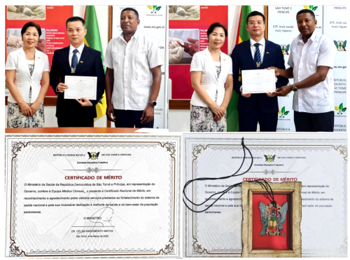 医疗队返回前夕,圣普卫生部在总部举行颁奖仪式,塞尔索·马托斯部长为全体队员颁发国家奖章和荣誉证书,表彰他们为提升当地医疗卫生水平、增进人民健康福祉所作出的卓越贡献。