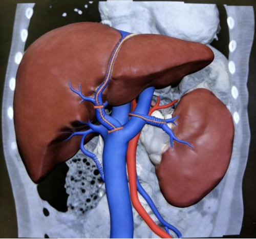 术后血管重建影像:肝门搭桥血管血流通畅、脾脏较术前缩小