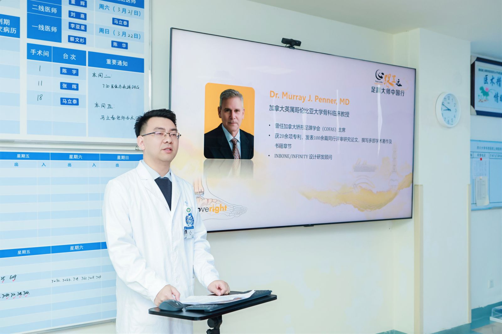 国际大师齐聚华西上锦,共探足踝置换新高度。3月20日,加拿大足踝大师 Murray J. Penner 教授到我院足踝外科&肢体矫形中心进行学术交流。活动汇聚国内外足踝外科顶尖专家,聚焦于全踝关节置换(TAR)技术的学术研讨,搭建起国际前沿技术与国内临床实践深度融合的高端学术平台,为西南地区足踝外科诊疗水平的提升注入强劲动力。我院樊涛副院长出席会议并致辞,足踝外科&肢体矫形中心医护团队参会。