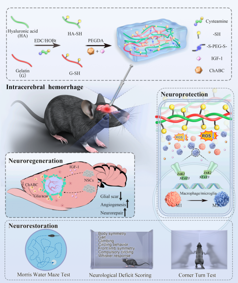 脑出血(intracerebral hemorrhage,ICH)是一种致残率和死亡率极高的脑中风亚型,对全球公众健康构成重大威胁。现有临床治疗方法,如血肿清除和降低颅内压,通常疗效有限,患者预后不佳。患者发生ICH后面临的继发性损伤主要由氧化应激和炎症反应驱动,同时出现神经元损伤、胶质瘢痕形成以及神经再生能力受限,而神经元和髓鞘完整性的恢复对于整体神经功能的有效恢复至关重要。因此,如何同时清除活性氧(reactive oxygen species,ROS)、抑制胶质瘢痕、促进神经再生,是目前ICH治疗的关键科学问题。本研究针对以上科学问题提出了一种结合神经保护和内源性神经再生的联合治疗策略,并通过设计一种可注射仿生水凝胶来实现该策略目标,从而达到增强ICH治疗效果的目的。