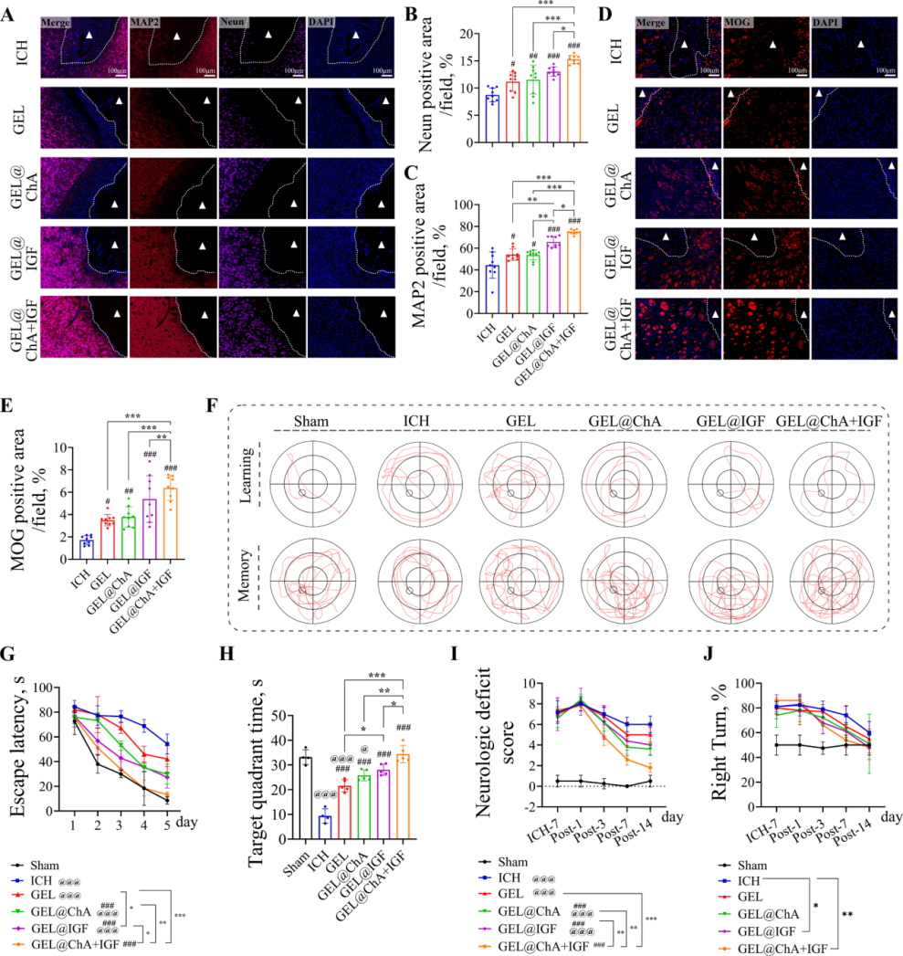 本研究假设可注射仿生水凝胶中含有的巯基基团可提供有效的ROS清除和抗炎的神经保护作用,并且水凝胶可作为载体递送药物进一步促进内源性神经再生,从而增强ICH治疗效果(图1)。研究内容上,我们首先通过调整巯基化明胶和巯基化透明质酸的比例,优化了水凝胶的多个关键性能指标,包括凝胶时间、力学模量、降解速率、微观结构以及ROS清除能力。然后我们评价了水凝胶的细胞、组织和血液相容性。体外细胞实验证明了水凝胶通过JAK2/STAT3信号通路调节巨噬细胞极化,有效抑制促炎性M1型表型并促进抗炎性M2型表型。同时,水凝胶显著促进了神经干细胞的增殖、迁移和分化,并增强了由内皮细胞介导的血管生成能力。在小鼠ICH模型中,水凝胶通过共递送硫酸软骨素酶ABC和胰岛素样生长因子-1(insulin-like growth factor 1,IGF-1),实现了调控小胶质细胞和巨噬细胞的活化与极化,减少了胶质瘢痕的形成,并且促进了内源性神经干细胞的增殖、迁移和血管化。这些作用加速了神经元和髓鞘的修复,最终显著改善了小鼠的认知和运动功能(图2)。