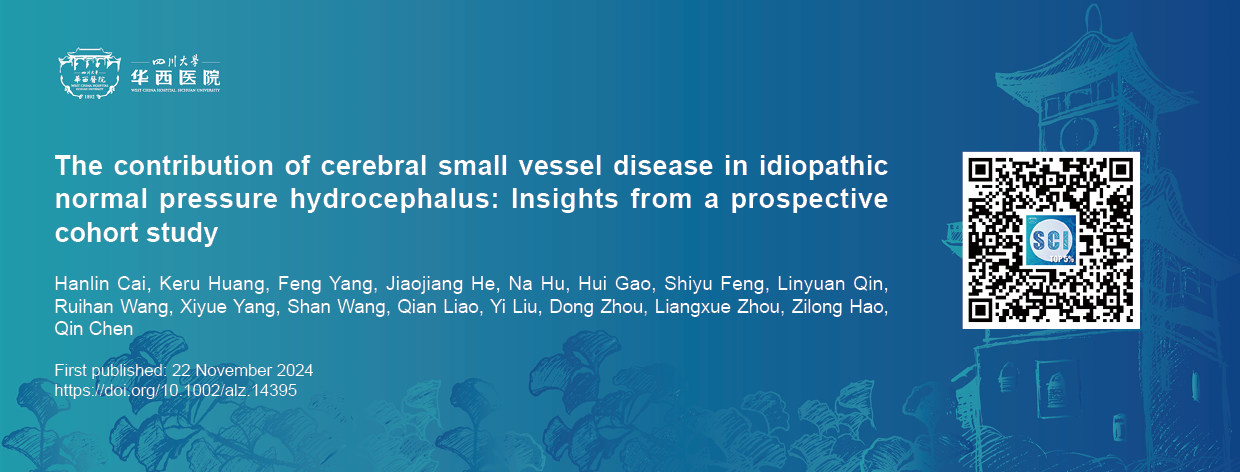 四川大学华西医院神经内科陈芹/郝子龙团队和神经外科周良学团队于2024年11月在Alzheimer’s & Dementia(Alzheimers Dement)发表文章“The contribution of cerebral small vessel disease in idiopathic normal pressure hydrocephalus: Insights from a prospective cohort study”(点击二维码阅读原文)。本项前瞻性队列研究发现特发性正常压力脑积水患者中脑小血管病共病患病率高,且与患者更严重的临床症状相关,但可能不影响患者分流术后结局, 为iNPH的临床管理提供了重要依据。
