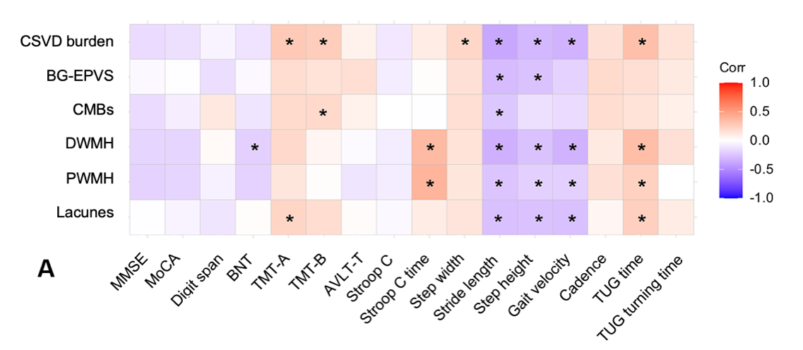 研究结果表明,78%的iNPH患者至少存在一种CSVD影像标志物(图1),高CSVD负荷与患者临床症状的严重程度呈正相关,且不同的CSVD影像标志物对患者认知和步态的影响存在显著差异(图2)。然而,术前CSVD负荷并未显著影响分流术后患者的改善情况。