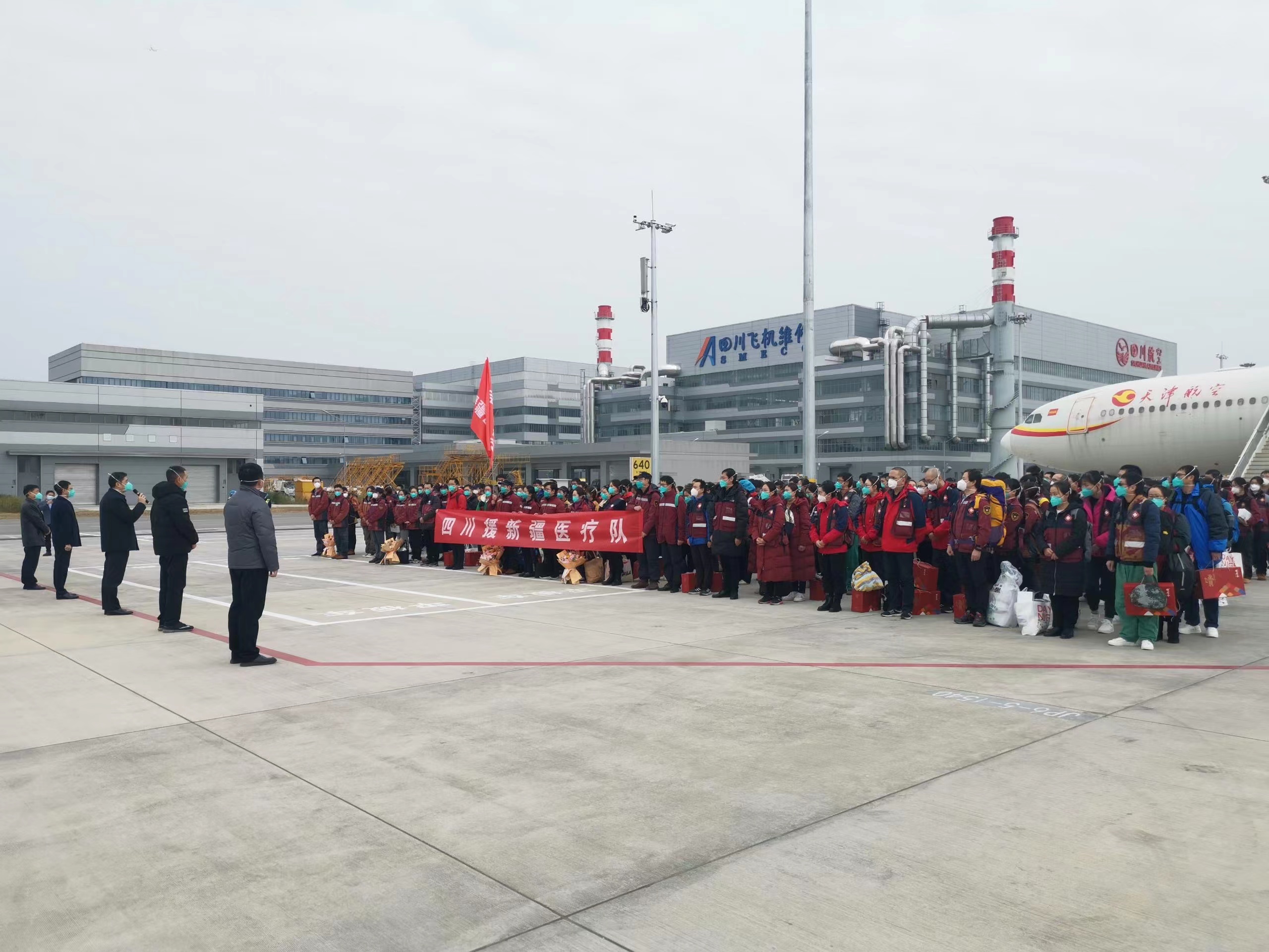 2022年12月9日下午14时许,伴随着从乌鲁木齐飞往成都的GS7481航班降落在成都天府机场,由四川大学华西医院重症医学科副主任王波教授担任队长的四川援新疆重症医疗队胜利返回成都。四川省卫生健康委副主任宋世贵、四川大学华西医院副院长吴泓到机场迎接。