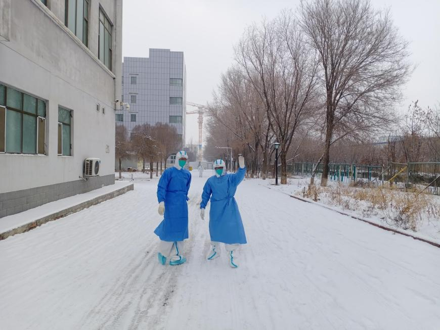 与四川的冬天迥然不同,乌鲁木齐零下十几度甚至二十几度的气温,也给医疗队队员们带来新的挑战。大雪纷飞,积雪覆地,每天外出巡诊、会诊,队员们都要时刻提防路面湿滑、避免摔跤。虽然队员们打趣隔离衣“夏天不透汗、冬天透心凉”,但病房中的温暖瞬间也不少。