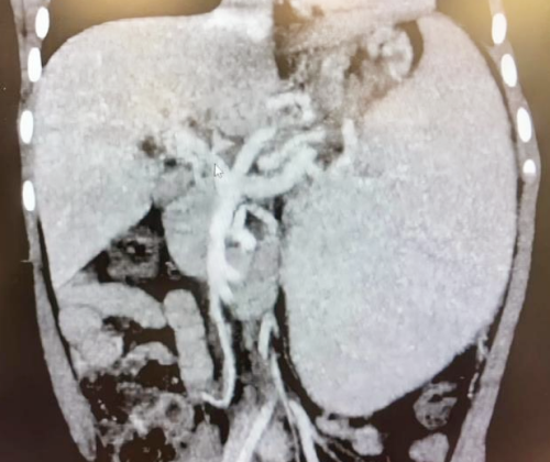 术后血管重建影像:肝门搭桥血管血流通畅、脾脏较术前缩小